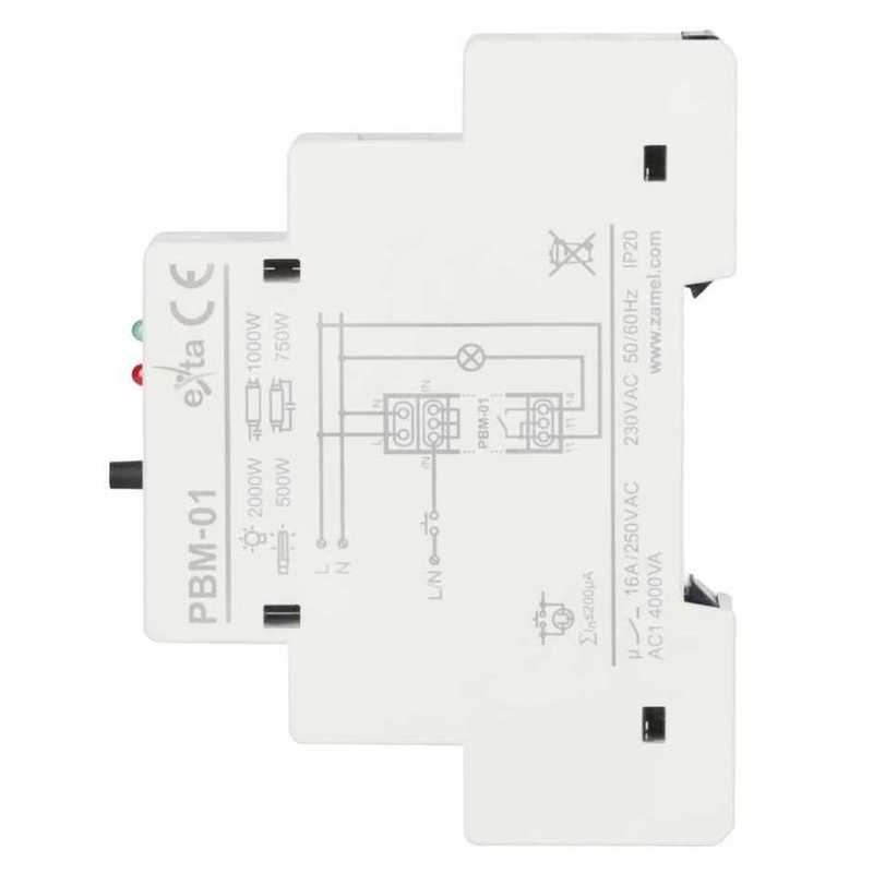 Przekaźnik bistabilny PBM-01 umożliwia sterowanie oświetleniem lub innymi urządzeniami za pomocą równolegle podłączonych przycisków jednobiegunowych. Każde naciśnięcie przycisku powoduje włączenie lub wyłączenie podłączonego urządzenia, co pozwala na tworzenie "inteligentnych" systemów sterowania. Układ działa z przewodem L lub N i można go łatwo zainstalować w dwużyłowej instalacji. Montowany na szynie TH35, posiada zieloną diodę LED sygnalizującą zasilanie oraz czerwoną diodę informującą o stanie przekaźnika. Wyjście przekaźnikowe o maksymalnej obciążalności 16A oraz funkcja TEST zapewniają dodatkową funkcjonalność.
