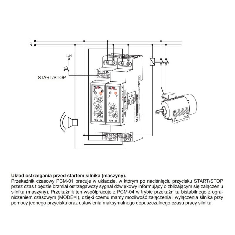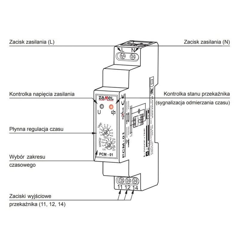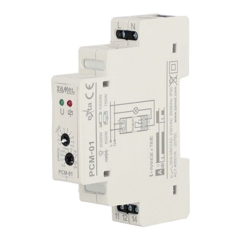 Przekaźnik czasowy PCM-01 pełni funkcję opóźnionego załączania w układach automatyki i sterowania, wyzwalany napięciem zasilającym. Charakteryzuje się szerokim zakresem nastaw czasu od 0,1 sekundy do 10 dni oraz dużą dokładnością. Dodatkowo oferuje funkcje stałego załączania lub wyłączania odbiornika. Urządzenie posiada diody LED sygnalizujące napięcie zasilania, stan przekaźnika oraz odmierzanie czasu. Wyjście przekaźnikowe ma jeden styk przełączany o maksymalnej obciążalności 16A. Przekaźnik montowany jest na szynie TH35, a jego kompaktowa obudowa zajmuje jeden moduł.