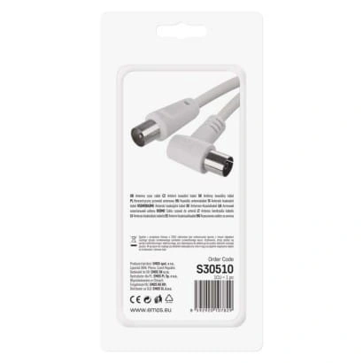 Koncentryczny przewód antenowy z wtyczką i gniazdkiem IEC. Przewód ma złącze kątowe (90°). Przewód jest podwójnie ekranowany w celu redukcji zakłóceń elektromagnetycznych. Długość przewodu wynosi 5 m. Przewód koncentryczny jest przeznaczony do SAT, DVB-T, ANT, DECODER, FLAT TV i TV.