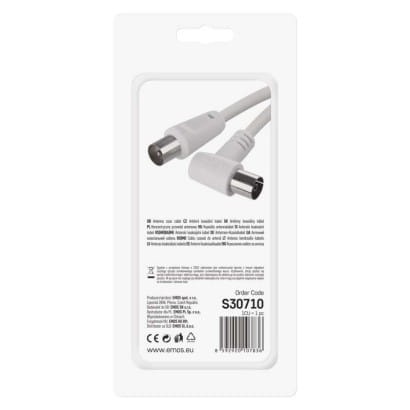 Koncentryczny przewód antenowy z wtyczką i gniazdkiem IEC. Przewód ma złącze kątowe (90°). Przewód jest podwójnie ekranowany w celu redukcji zakłóceń elektromagnetycznych. Długość przewodu wynosi 7,5 m. Przewód koncentryczny jest przeznaczony do SAT, DVB-T, ANT, DECODER, FLAT TV i TV.
