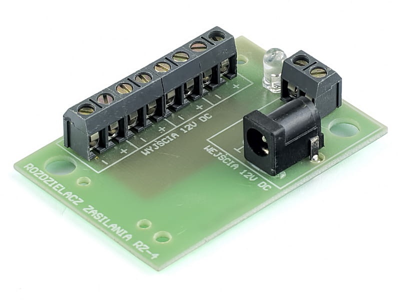 Rozdzielacz zasilania Rz4 umożliwia rozdzielnie zasilania 12/24V DC doprowadzonego z zasilacza z wtykiem 5.5/2.1 DC na zaciski śrubowe. Płytka przydatna jest w podłączeniu np. kilku pasków led do zasilacza.