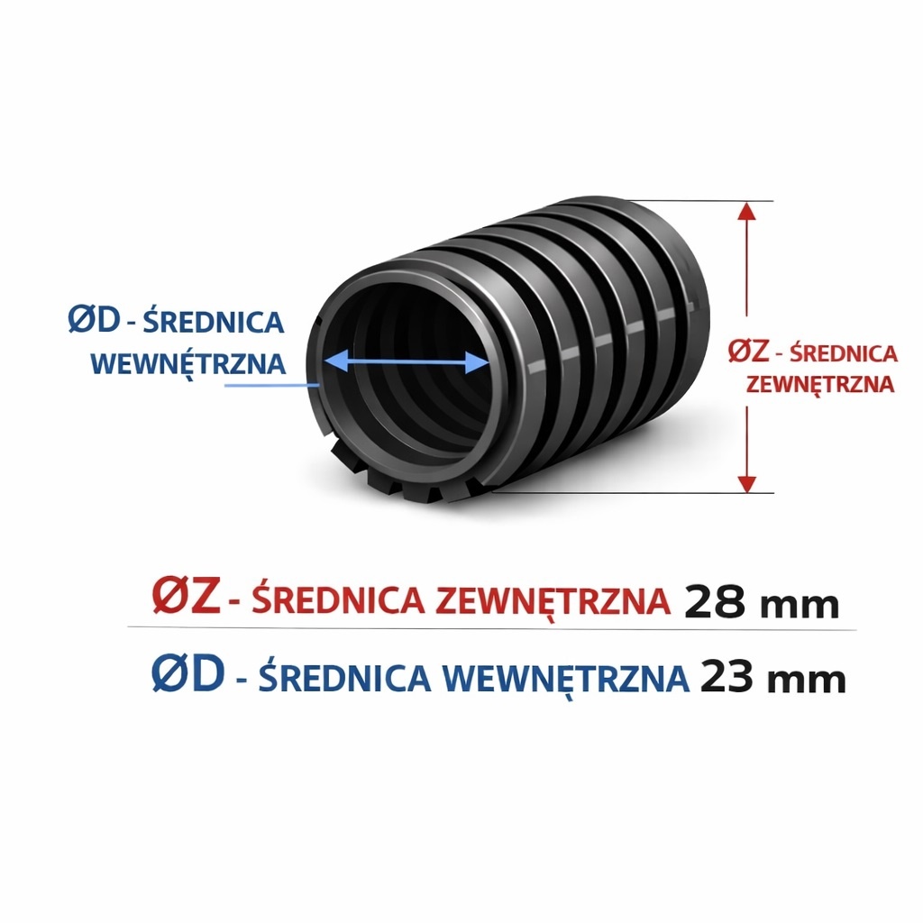 Rura giętka karbowana 28/23 wykonana z wysokiej jakości tworzywa PVC to wytrzymały peszel z wbudowanym pilotem (żyłką do przeciągania przewodów), przeznaczony do ochrony oraz prowadzenia większych wiązek przewodów elektrycznych w instalacjach niskiego napięcia wymagających podwyższonej odporności mechanicznej. Karbowana konstrukcja zapewnia elastyczność i umożliwia łatwe dopasowanie rury do trasy instalacyjnej, nawet w bardziej wymagających warunkach montażowych. Podwyższona odporność na ściskanie do 750 N skutecznie chroni przewody przed uszkodzeniami mechanicznymi i naciskiem. Materiał PVC posiada właściwości samogasnące, co zwiększa bezpieczeństwo użytkowania instalacji, szczególnie w przestrzeniach narażonych na podwyższone ryzyko pożaru. Wbudowany pilot znacząco usprawnia i przyspiesza proces instalacji, umożliwiając wygodne przeciąganie kabli nawet na długich odcinkach. Długość 50 m sprawdzi się w budownictwie mieszkaniowym, komercyjnym oraz w instalacjach technicznych i przemysłowych.