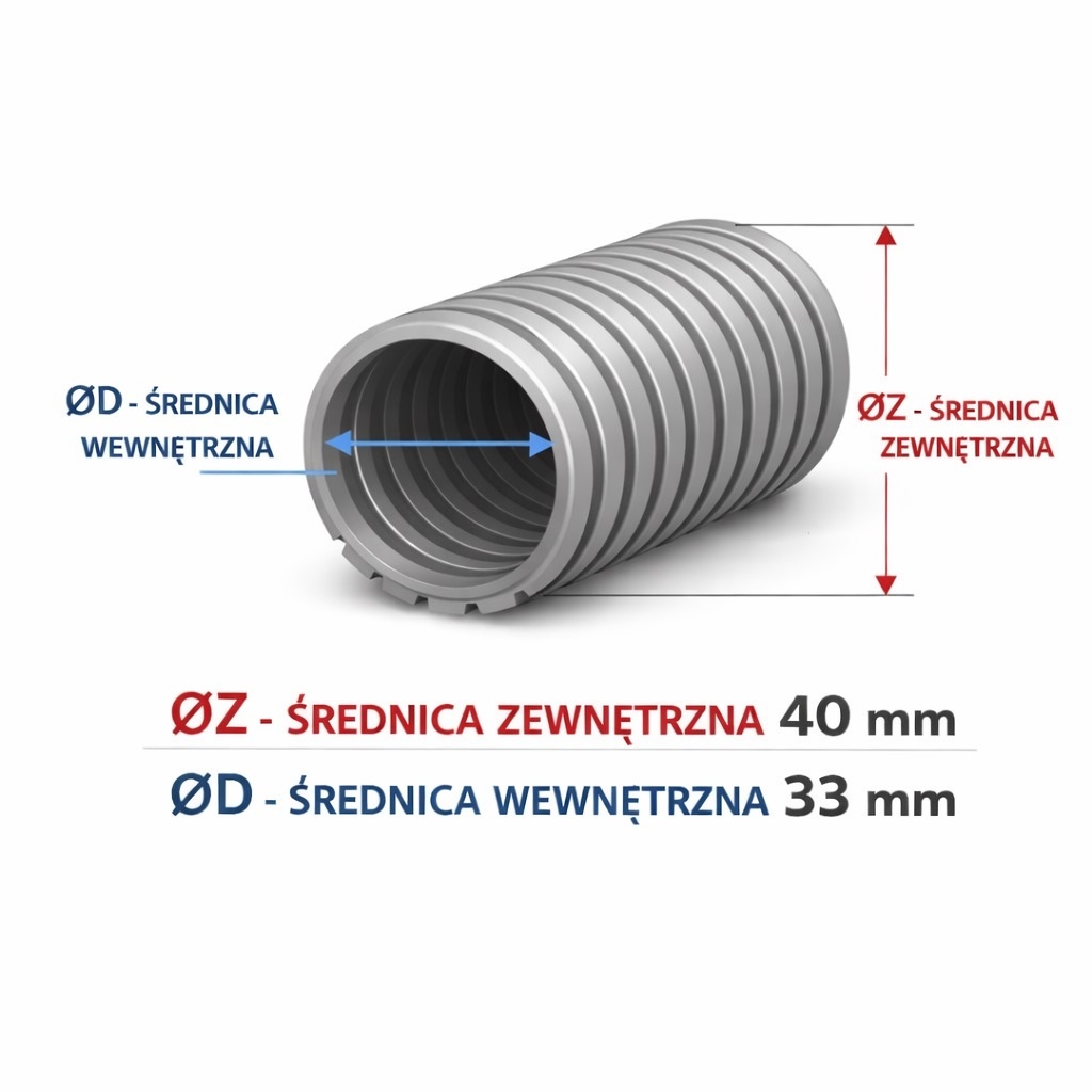 Rura giętka karbowana 40/33 PVC przeznaczona jest do osłony i prowadzenia przewodów w instalacjach elektrycznych podtynkowych i natynkowych. Znajduje zastosowanie w budownictwie mieszkaniowym i komercyjnym, instalacjach technicznych, rozdzielniach oraz wszędzie tam, gdzie konieczne jest prowadzenie dużych ilości przewodów.
