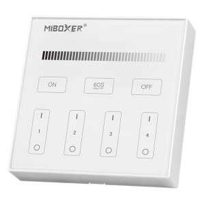 4-strefowy panel naścienny B1 / B1-B do kontrolerów MiBoxer, wykorzystujący technologię transmisji bezprzewodowej 2.4G RF. Umożliwia regulację jasności. Możliwość ustawienia automatycznego wyłączenia światła po 60 sekundach. Maksymalna odległość sterowania do 30 m. Zasilanie bateryjne 3 V (2 szt. AAA). Montaż nie wymagający użycia narzędzi i dodatkowego okablowania.