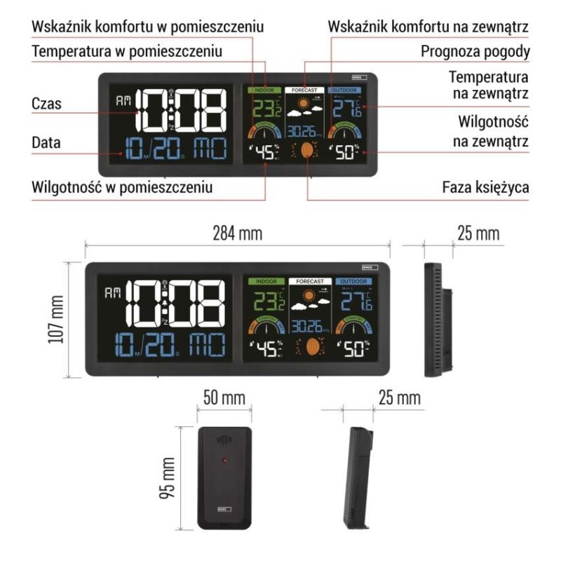 Stacja mierzy temperaturę wewnętrzną w zakresie 0°C do +50°C oraz zewnętrzną od -40°C do +70°C z rozdzielczością 0,1°C. Wilgotność względna monitorowana jest w zakresie 20–99% RH. Wbudowany barometr pracuje w zakresie 800–1100 hPa i umożliwia obserwację trendów zmian ciśnienia.