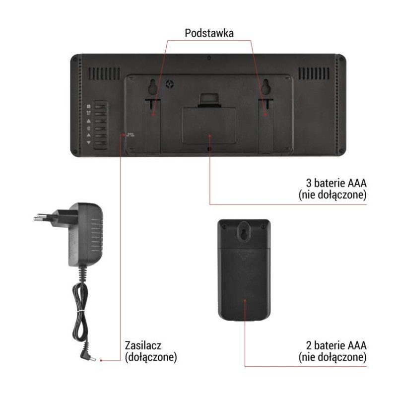 Jednostka główna może być zasilana z dołączonego zasilacza sieciowego 5 V DC / 1 000 mA lub bateryjnie (3× 1,5 V AAA). Czujnik zewnętrzny zasilany jest 2× 1,5 V AAA. Brak źródła zasilania w zestawie! - sprawdź pasujące baterie