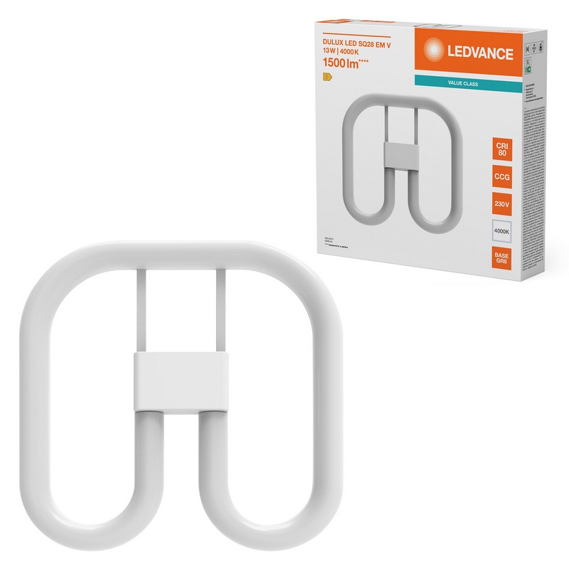 Świetlówka LED DULUX SQ28 EM & AC MAINS VALUE 13W 840 GR8 marki LEDVANCE to energooszczędne źródło światła zaprojektowane jako bezpośredni zamiennik kompaktowych świetlówek CFLni 28W z trzonkiem GR8. Produkt może pracować zarówno ze statecznikiem magnetycznym (CCG), jak i bezpośrednio z sieci 220–240 V AC, co umożliwia szybką modernizację istniejących opraw bez konieczności ich wymiany.