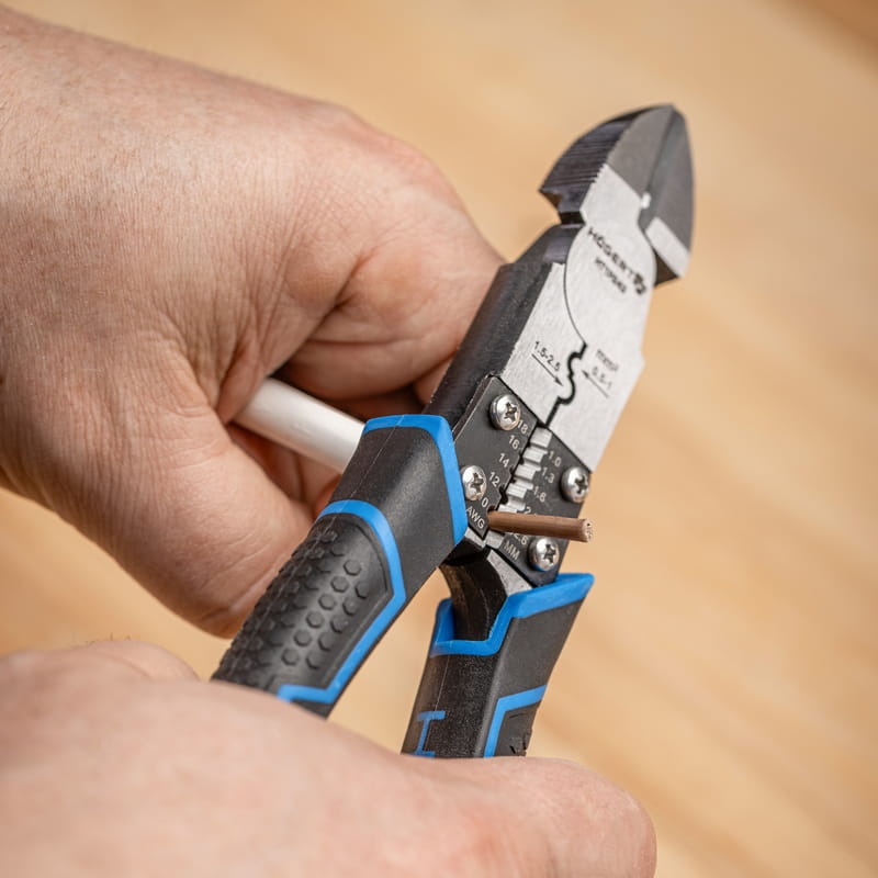 Wielofunkcyjne szczypce boczne 6w1 do prac instalacyjnych i serwisowych. Jedno narzędzie łączy funkcje cięcia, zaciskania i ściągania izolacji, oszczędzając miejsce w torbie narzędziowej.