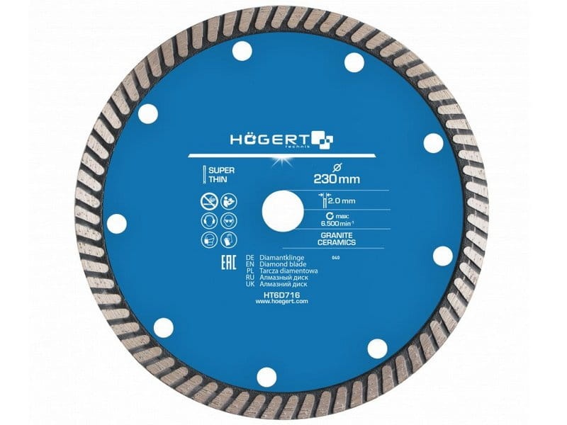 Tarcza diamentowa HT6D716 Högert do szlifierek kątowych i maszyn tnących. Przeznaczona do pracy na sucho. Nie posiada ząbków na obrzeżach, dlatego może być wykorzystywana do przecinania twardych materiałów budowlanych, takich jak cegła, klinkier, beton komórkowy, kostka brukowa czy płytki ceramiczne.