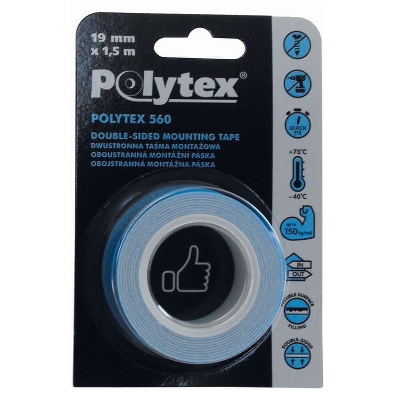 Dwustronnie przylepna taśma montażowa (Polytex 560) z pianką polietylenową o wyjątkowo dużej sile klejenia, dużej wytrzymałości na ścinanie z wysoką przyczepnością początkową, do wewnętrznych i zewnętrznych zastosowań. Sprawdzi się przede wszystkim do pewnego i szybkiego mocowania płaskich przedmiotów, wszędzie tam, gdzie wymagana jest duża nośność, np. jako mocowanie luster, kanałów kablowych) Trwale łączy powierzchnie ceramiczne, szklane, malowane, drewniane, stalowe i większość tworzyw sztucznych (PVC, PP, PE, Plexi) wewnątrz i na zewnątrz. Taśma montażowa to wygodne mocowanie bez użycia śrub, wkrętów czy gwoździ.