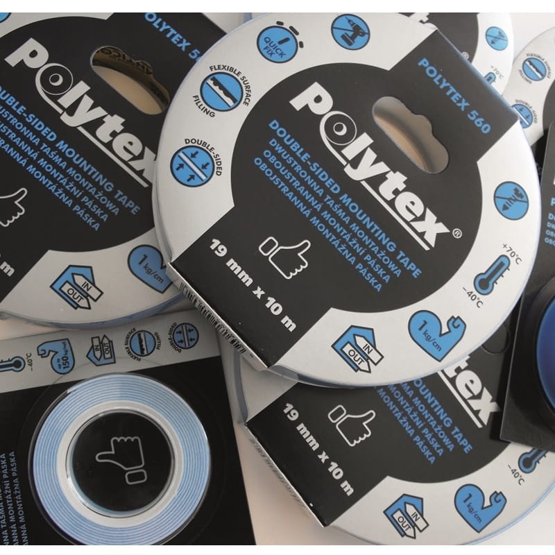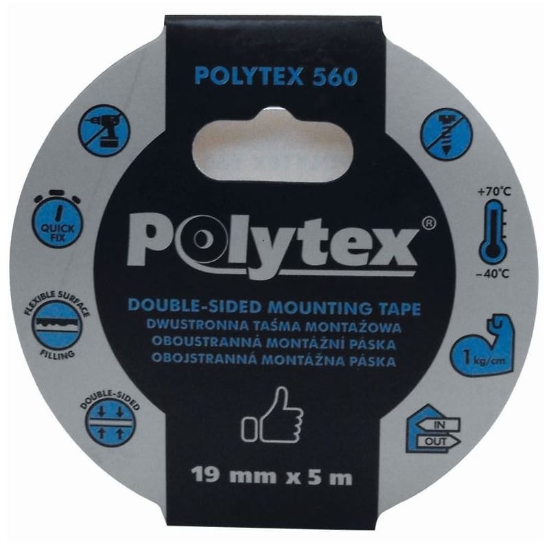 Dwustronnie przylepna taśma montażowa (Polytex 560) z pianką polietylenową o wyjątkowo dużej sile klejenia, dużej wytrzymałości na ścinanie z wysoką przyczepnością początkową, do wewnętrznych i zewnętrznych zastosowań. Sprawdzi się przede wszystkim do pewnego i szybkiego mocowania płaskich przedmiotów, wszędzie tam, gdzie wymagana jest duża nośność, np. jako mocowanie luster, kanałów kablowych) Trwale łączy powierzchnie ceramiczne, szklane, malowane, drewniane, stalowe i większość tworzyw sztucznych (PVC, PP, PE, Plexi) wewnątrz i na zewnątrz. Taśma montażowa to wygodne mocowanie bez użycia śrub, wkrętów czy gwoździ.