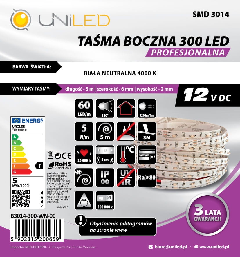 Taśma LED z linii PROFESJONALNEJ wyróżnia się bocznym kierunkiem świecenia i wyjątkowo wąskim podłożem o szerokości 6 mm. Model o barwie neutralnej (4000–4500K) zapewnia naturalne, przyjemne dla oka światło idealne do zastosowań użytkowych i estetycznych.