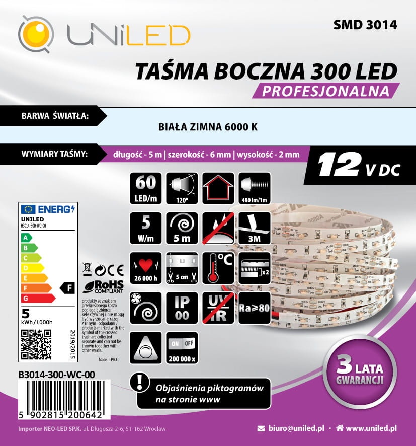 Taśma LED z profesjonalnej serii UNILED zapewnia intensywne, zimne światło o temperaturze barwowej 5500–6500K. Dzięki bocznemu kierunkowi świecenia i wąskiej konstrukcji (6 mm), sprawdza się w nowoczesnych i technicznych aranżacjach świetlnych.