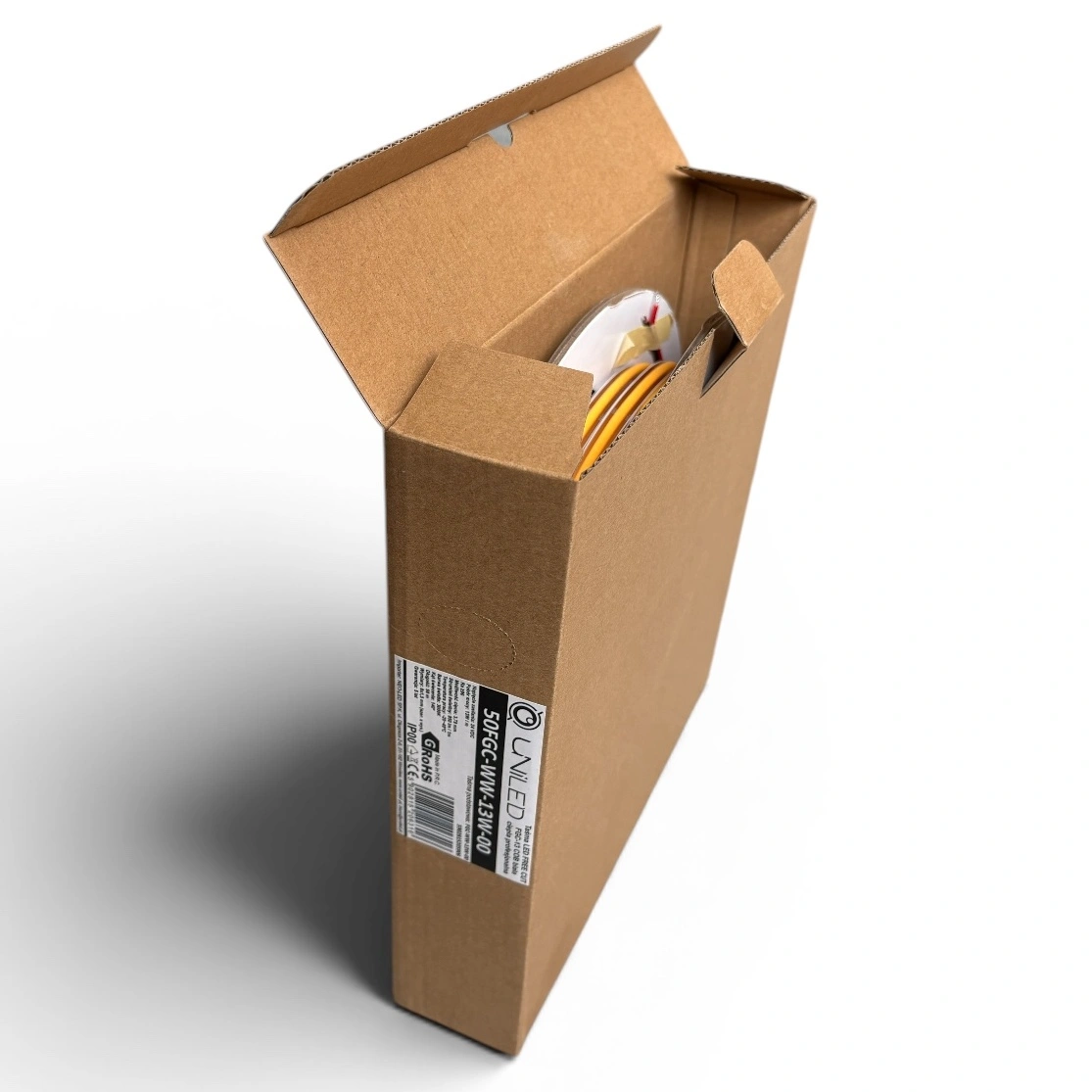Taśma została wykonana w technologii COB (Chip On Board), co oznacza gęste rozmieszczenie diod LED na całej długości. Dzięki temu uzyskujemy efekt jednolitej, ciągłej linii światła bez widocznych punktów świetlnych – nawet bez zastosowania klosza mlecznego.