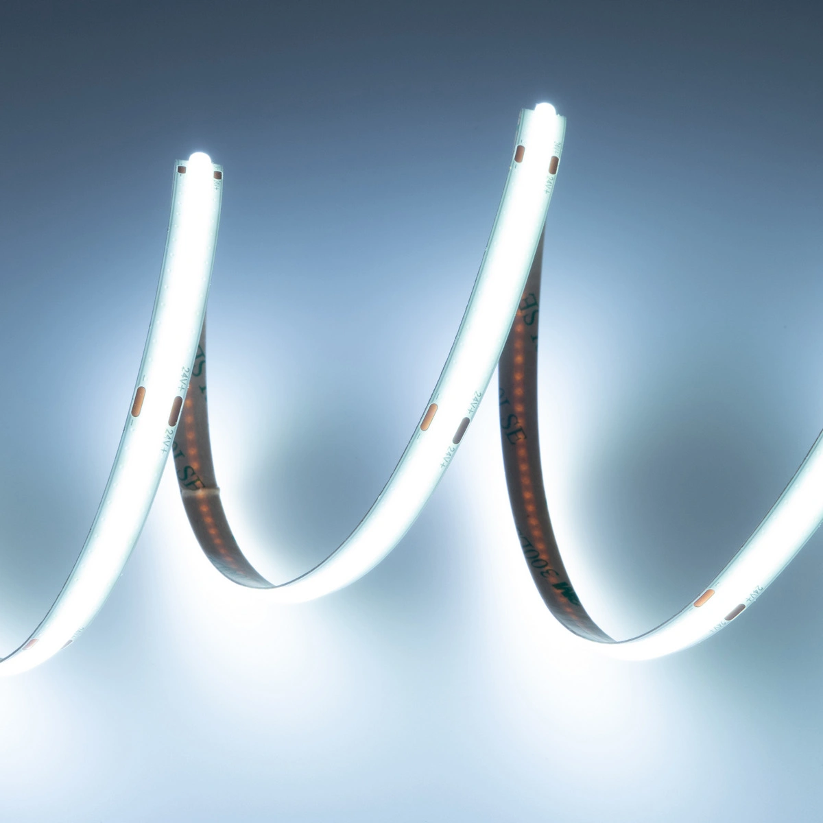 Taśma została wykonana w technologii COB (Chip On Board), co oznacza gęste rozmieszczenie diod LED na całej długości. Dzięki temu uzyskujemy efekt jednolitej, ciągłej linii światła bez widocznych punktów świetlnych – nawet bez zastosowania klosza mlecznego.