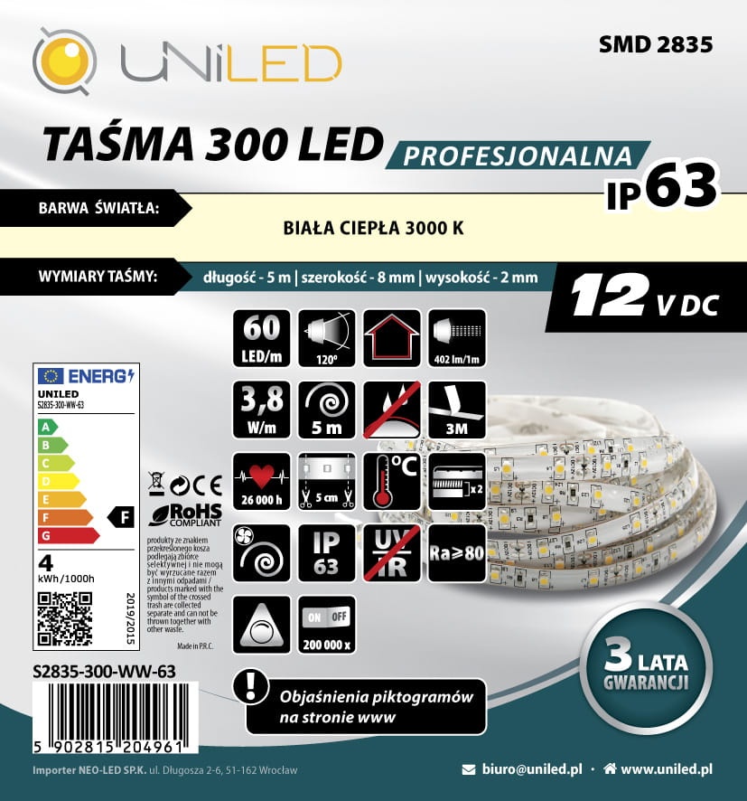 Taśma LED 12V DC o podwyższonej odporności na warunki zewnętrzne IP63 w silikonowej osłonie do zastosowań profesjonalnych. Dostępna jest w jednej z trzech barw światła białego 3500K, 4500K i 6500K. Pasek LED wykonany jest na wysokiej jakości podłożu dwustronnym z duża zawartością miedzi co gwarantuje stabilną pracę przy długich ciągach świetlnych. Niski pobór mocy 3,8W/m przy jednocześnie stosunkowo dużej jasności pozwala z powodzeniem stosować taśmę UNILED do oświetlenia nisz z płyt GK oraz sufitów podwieszanych. Taśma wykorzystuje markowe ledy SMD 2835 charakteryzujące się wysoką powtarzalnością parametrów świetlnych. Pasek LED pokryty jest wysokiej jakości powłoką silikonową znacznie przewyższającą podobne rozwiązania dostępne na rynku. W stosunku do tańszych produktów długo zachowuje swoje właściwości - elastyczność i kolor (nie sztywnieje i nie żółknie). Jest to produkt bardzo chętnie kupowany przez profesjonalnych instalatorów.