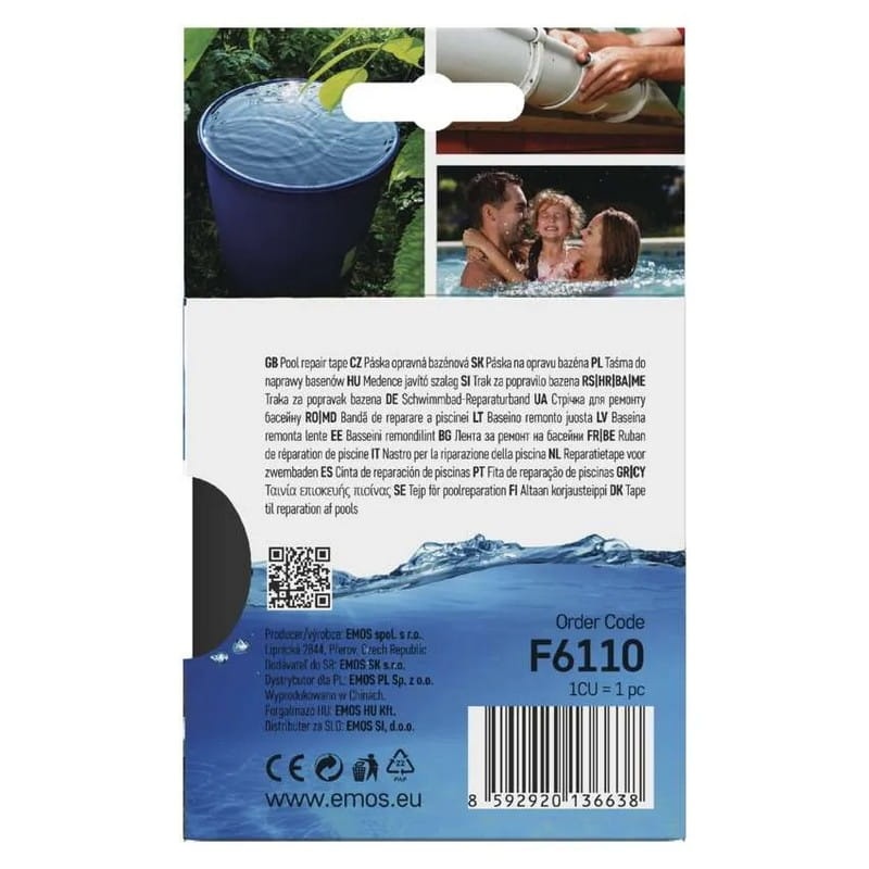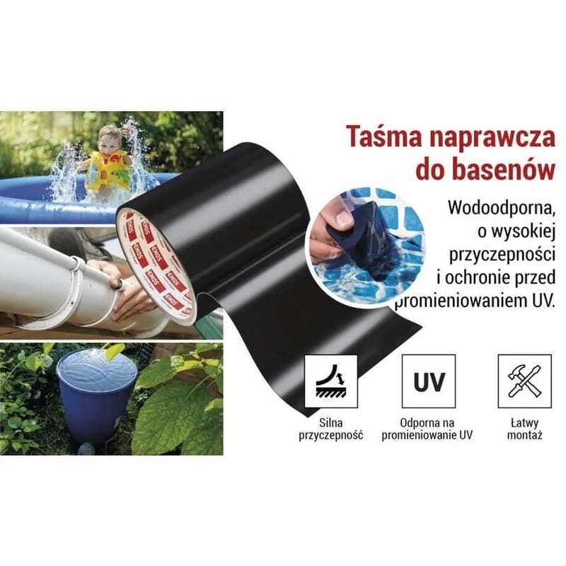 Taśma naprawcza do basenów. Czarna taśma klejąca z syntetycznym klejem.