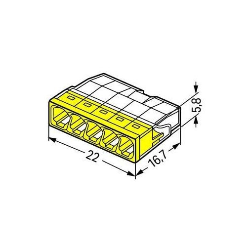 WAGO 2273-205 to złączka instalacyjna do szybkiego, pewnego łączenia przewodów jednodrutowych w puszkach. Przezroczysta obudowa ułatwia kontrolę prawidłowego wsunięcia żyły, a żółta pokrywa wyróżnia wariant 5-torowy w serii 2273. Maksymalny przekrój przewodu to 2,5 mm², a złączka jest przystosowana do pracy w temperaturze otoczenia do T60 (60 °C).