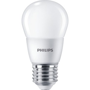 Żarówka LED PHILIPS CorePro z trzonkiem E27 P48 (mała kulka) o białej neutralnej 4000K barwie światła. Żarówka emituje światło o strumieniu 806lm pobierając z sieci tylko 7W. Jest zamiennikiem tradycyjnej żarówki E27 o mocy 60W. Doskonale sprawdza się w żyrandolach, lampkach nocnych oraz w kinkietach.