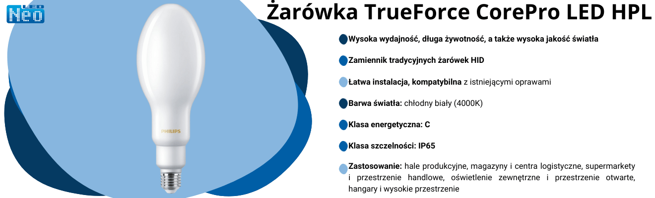 Żarówki Philips TrueForce Core LED HPL to energooszczędne zamienniki tradycyjnych żarówek HID (wysokoprężnych, takich jak HPI, SON, czy HPL) stosowanych w sektorach przemysłowym i handlowym. W przypadku tradycyjnych źródeł światła HID, statecznik jest niezbędny, aby stabilizować napięcie i prąd, ponieważ te żarówki wymagają bardzo wysokiego napięcia przy zapłonie i kontrolowania przepływu prądu w trakcie pracy. Bez statecznika żarówka HID mogłaby ulec uszkodzeniu lub nie działać prawidłowo. Z kolei żarówka PHILIPS TForce ma wbudowaną elektronikę, która automatycznie reguluje napięcie i prąd. Dzięki temu przy wymianie żarówek HID na LED nie jest już potrzebny statecznik, co upraszcza proces modernizacji. Lampy LED są znacznie bardziej efektywne pod względem energetycznym, nie wymagają wysokiego napięcia przy uruchamianiu i same regulują swoje zasilanie. Zostały zaprojektowane z myślą o modernizacji istniejących systemów oświetleniowych, zapewniając wydajniejsze, bardziej ekologiczne i ekonomiczne rozwiązanie. Dodatkowo, unikalna konstrukcja o stopniu szczelności IP65 oznacza, że lampy TrueForce Core LED HPL do montażu bezpośrednio na słupie mogą być używane zarówno na zewnątrz, jak i w pomieszczeniach.