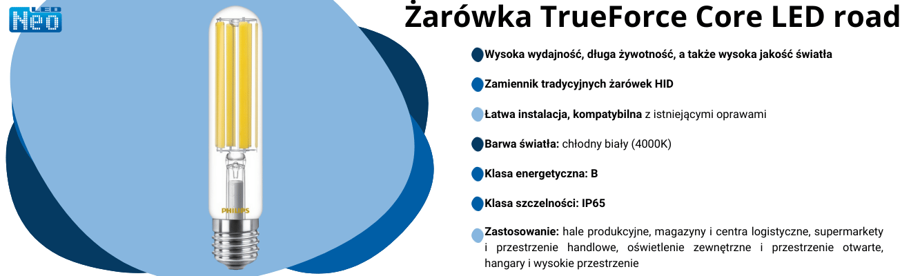 Żarówki Philips TrueForce Core LED road to energooszczędne zamienniki tradycyjnych żarówek HID (wysokoprężnych, takich jak HPI, SON, czy HPL) stosowanych w sektorach przemysłowym i handlowym. W przypadku tradycyjnych źródeł światła HID, statecznik jest niezbędny, aby stabilizować napięcie i prąd, ponieważ te żarówki wymagają bardzo wysokiego napięcia przy zapłonie i kontrolowania przepływu prądu w trakcie pracy. Bez statecznika żarówka HID mogłaby ulec uszkodzeniu lub nie działać prawidłowo. Z kolei żarówka PHILIPS TForce ma wbudowaną elektronikę, która automatycznie reguluje napięcie i prąd. Dzięki temu przy wymianie żarówek HID na LED nie jest już potrzebny statecznik, co upraszcza proces modernizacji. Lampy LED są znacznie bardziej efektywne pod względem energetycznym, nie wymagają wysokiego napięcia przy uruchamianiu i same regulują swoje zasilanie. Zostały zaprojektowane z myślą o modernizacji istniejących systemów oświetleniowych, zapewniając wydajniejsze, bardziej ekologiczne i ekonomiczne rozwiązanie. Dodatkowo, unikalna konstrukcja o stopniu szczelności IP65 oznacza, że lampy TrueForce Core LED do montażu bezpośrednio na słupie mogą być używane zarówno na zewnątrz, jak i w pomieszczeniach.