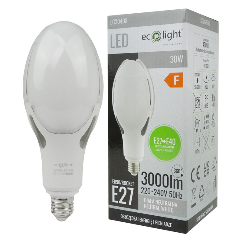 Żarówka LED Ecolight Rocket E27→E40 30W 4000K 3000lm to wszechstronne źródło światła o wysokiej efektywności i niskim zużyciu energii. Neutralna barwa światła, trwałość 20 000h i szeroki kąt świecenia 300° sprawiają, że doskonale sprawdzi się w zastosowaniach przemysłowych i komercyjnych.
