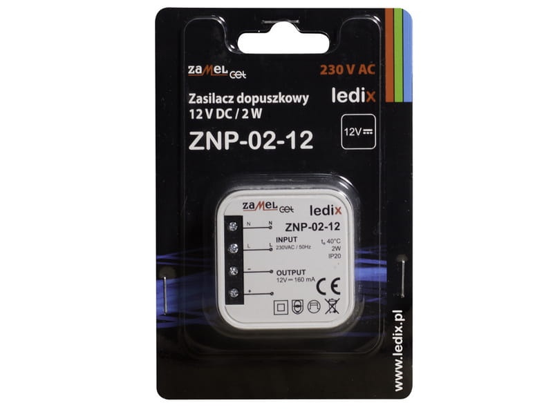 Zasilacz ZNP-02-12 to profesjonalny zasilacz impulsowy o napięciu wyjściowym 12V DC i mocy znamionowej 2W. Zasilacz przeznaczony jest do współpracy z produktami LEDIX (oprawy, sterowniki, odbiorniki radiowe) zasilanymi napięciem na 12V DC. Montaż bezpośrednio w puszce instalacyjnej. Produkt posiada zabezpieczenia przeciwzwarciowe oraz przeciążeniowe. Wysoka sprawność oraz bardzo mały pobór mocy w trybie czuwania.