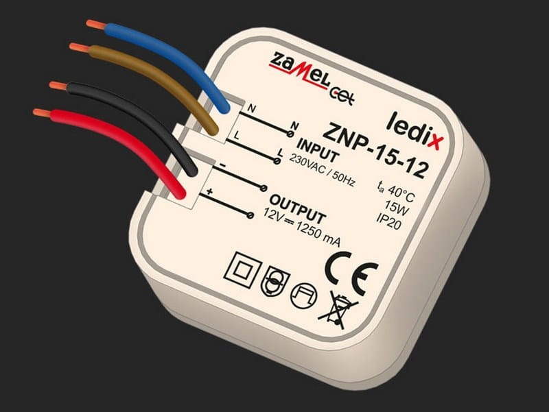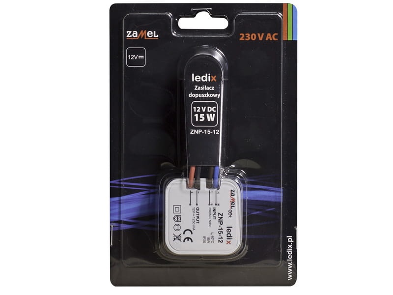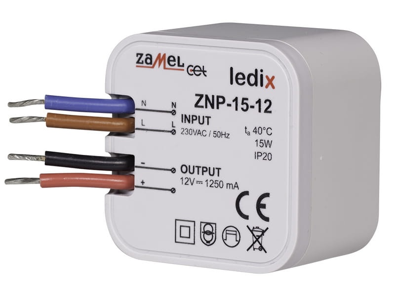 Zasilacz ZNP-15-12 to profesjonalny zasilacz impulsowy o napięciu wyjściowym 12V DC i mocy znamionowej 15W. Zasilacz przeznaczony jest do współpracy z produktami LEDIX (oprawy, sterowniki, odbiorniki radiowe) zasilanymi napięciem na 12V DC. Montaż bezpośrednio w puszce instalacyjnej. Produkt posiada zabezpieczenia przeciwzwarciowe oraz przeciążeniowe. Wysoka sprawność oraz bardzo mały pobór mocy w trybie czuwania. Zasilacz spełnia wymagania norm zharmonizowanych.