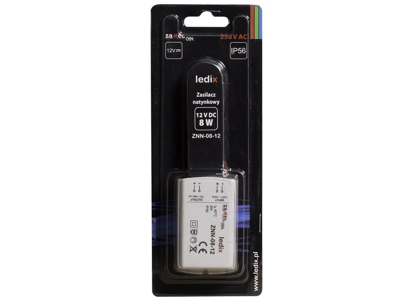 ZNN-08-12 to profesjonalny zasilacz natynkowy, impulsowy o stabilizacji napięciowej 12V DC i znamionowej mocy wyjściowej wynoszącej 8W. Zasilacz rekomendowany jest do zasilania opraw oraz osprzętu należącego do grupy LEDIX. ZNN-08-12 ze względu na bardzo mały pobór mocy w trybie czuwania stanowi ekonomiczne rozwiązanie, przeznaczone do pracy ciągłej. Produkt posiada zabezpieczenia przeciwzwarciowe oraz przeciążeniowe, które zwiększają bezpieczeństwo jego użytkowania.