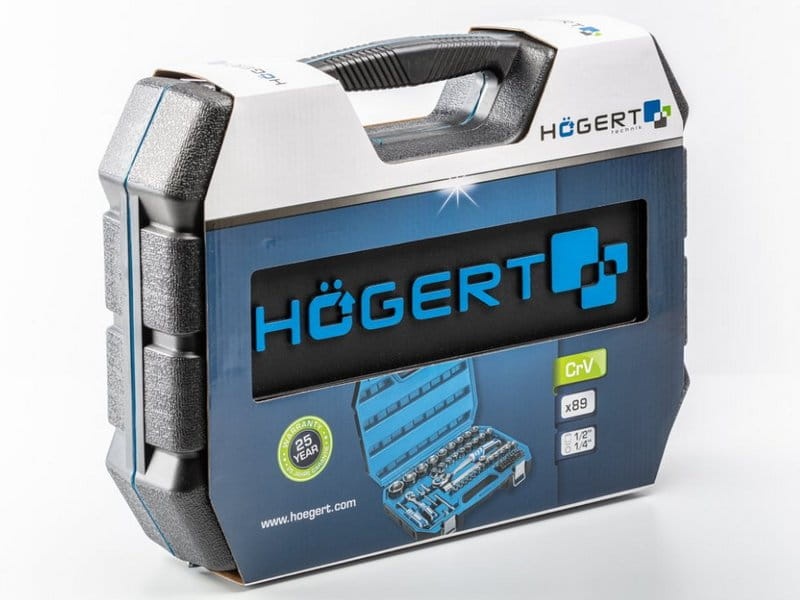 Zestaw nasadek, końcówek wkrętakowych i akcesoriów 1/4" i 1/2" HT1R424 Högert wykonany został w większości ze stali stopowej chromowo-wanadowej o wysokiej odporności na korozję, ścieranie i charakteryzującą się dużą wytrzymałością mechaniczną. Mechanizm zapadkowy dołączonych grzechotek wykonany został ze stali chromowo-molibdenowej, która przeznaczona jest do pracy na dużych obciążeniach. Narzędzia zapakowane w dwukolorową walizkę z metalowymi klamrami, wnętrze walizki gwarantuje niezmienność pozycji poszczególnych elementów podczas transportu.