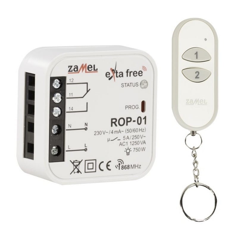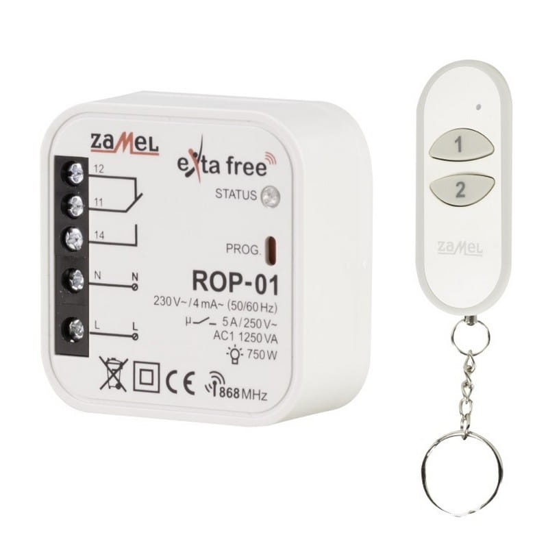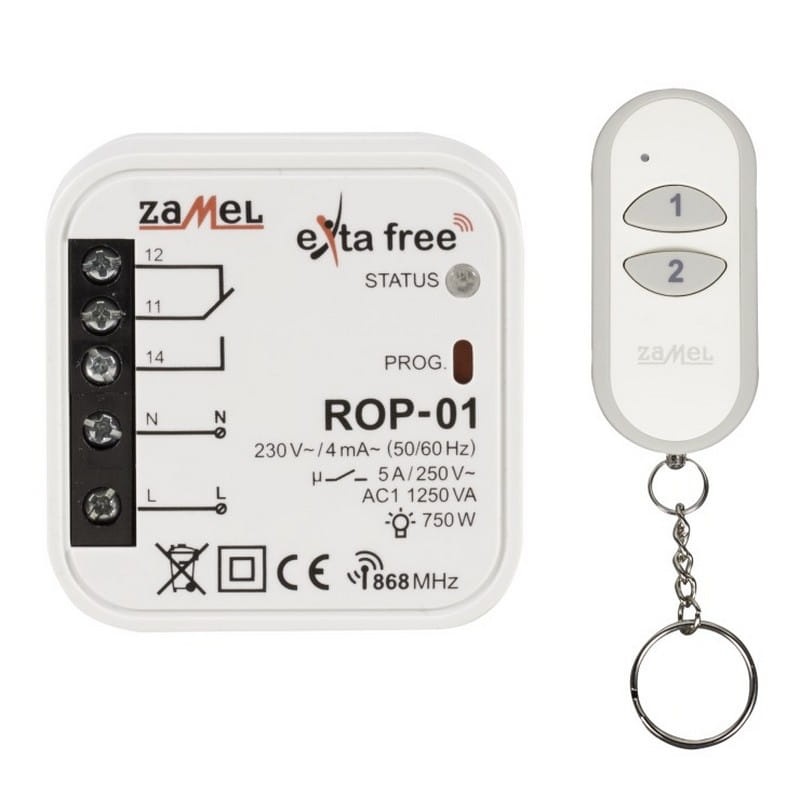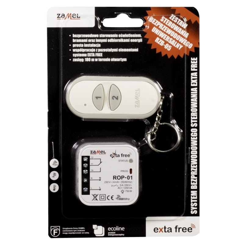 Kompletny zestaw sterowania bezprzewodowego składa się z 2-kanałowego pilota P-257/2 oraz 1-kanałowego, bistabilnego radiowego odbiornika dopuszkowego ROP-01. Odbiornik można łatwo zamontować w obudowie lampy lub w puszce podtynkowej o średnicy 60 mm. Urządzenie charakteryzuje się niskim poborem mocy i możliwością pracy ciągłej. Zestaw umożliwia sterowanie oświetleniem, wentylacją, ogrzewaniem, nawadnianiem oraz innymi systemami. Obsługuje 5 trybów pracy: załączanie, wyłączanie, tryb monostabilny, bistabilny oraz opóźnione wyłączenie (tryb czasowy). Zasięg działania może zostać zwiększony poprzez zastosowanie retransmitera RTN-01. Dodatkowo, drugi przycisk pilota może być używany do sterowania innym odbiornikiem z serii EXTA FREE. Zasięg działania zestawu wynosi do 180 metrów.
